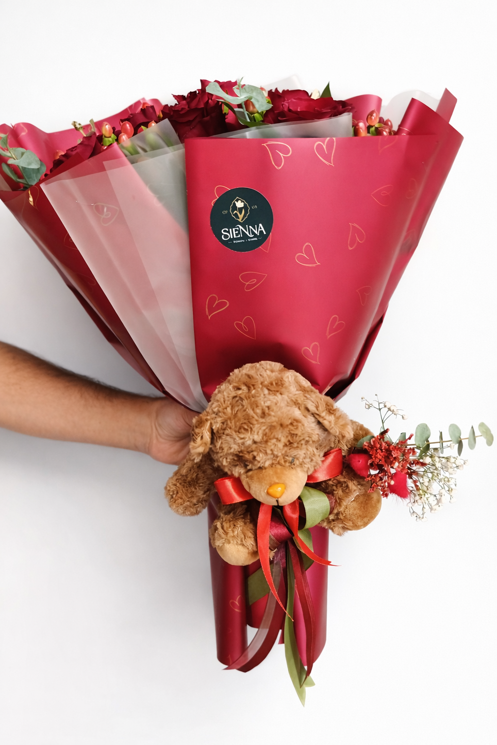 Ürünümüz de 15 adet ekvator kırmızı gül, hiperikum, okaliptüs,cipso ,teddy bear (ayıcık) bulunmaktadır.