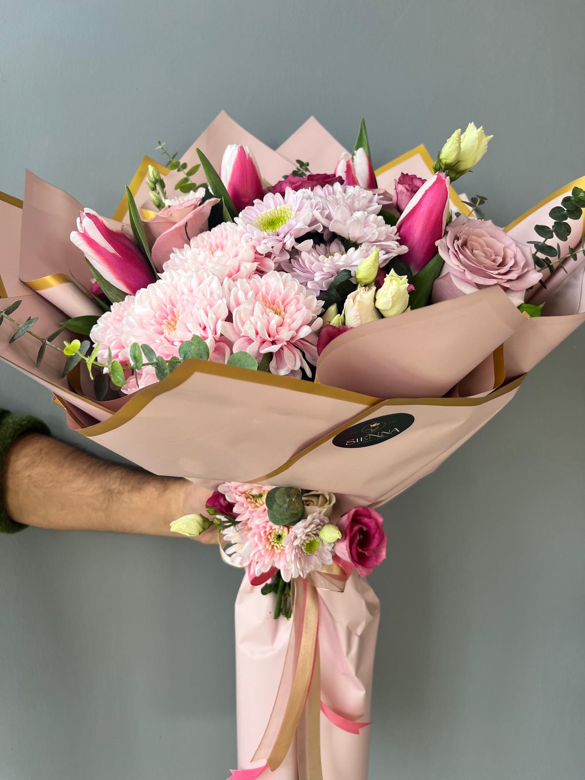 Ürünümüz de 5 adet lila ekvator gülü,İthal uçuk pembe krizantem,5 adet pembe lale , lisyantus, okaliptüs bulunmaktadır.