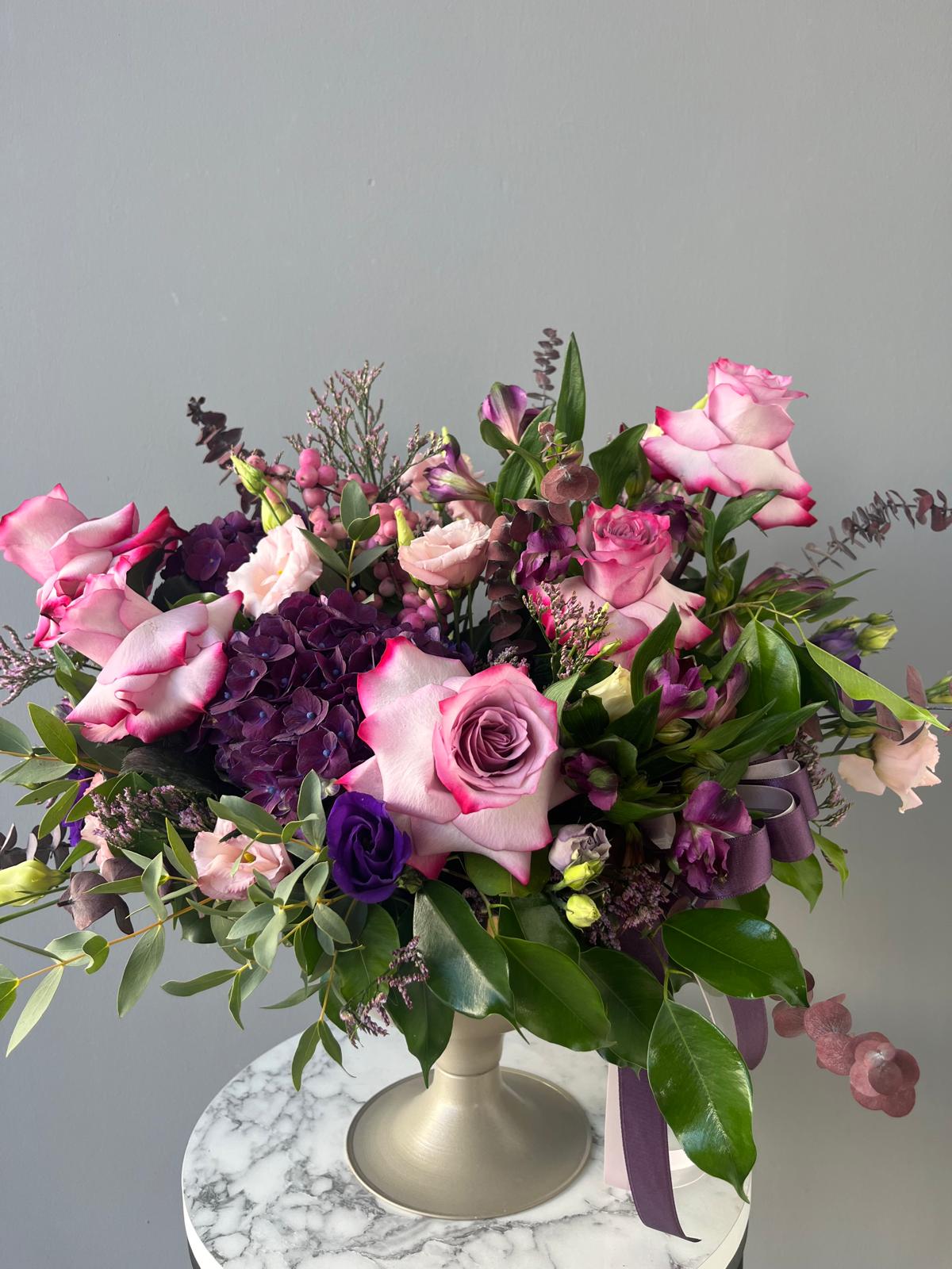 Lila ekvator gülleri ve ortancalı doğum günü aranjmanı