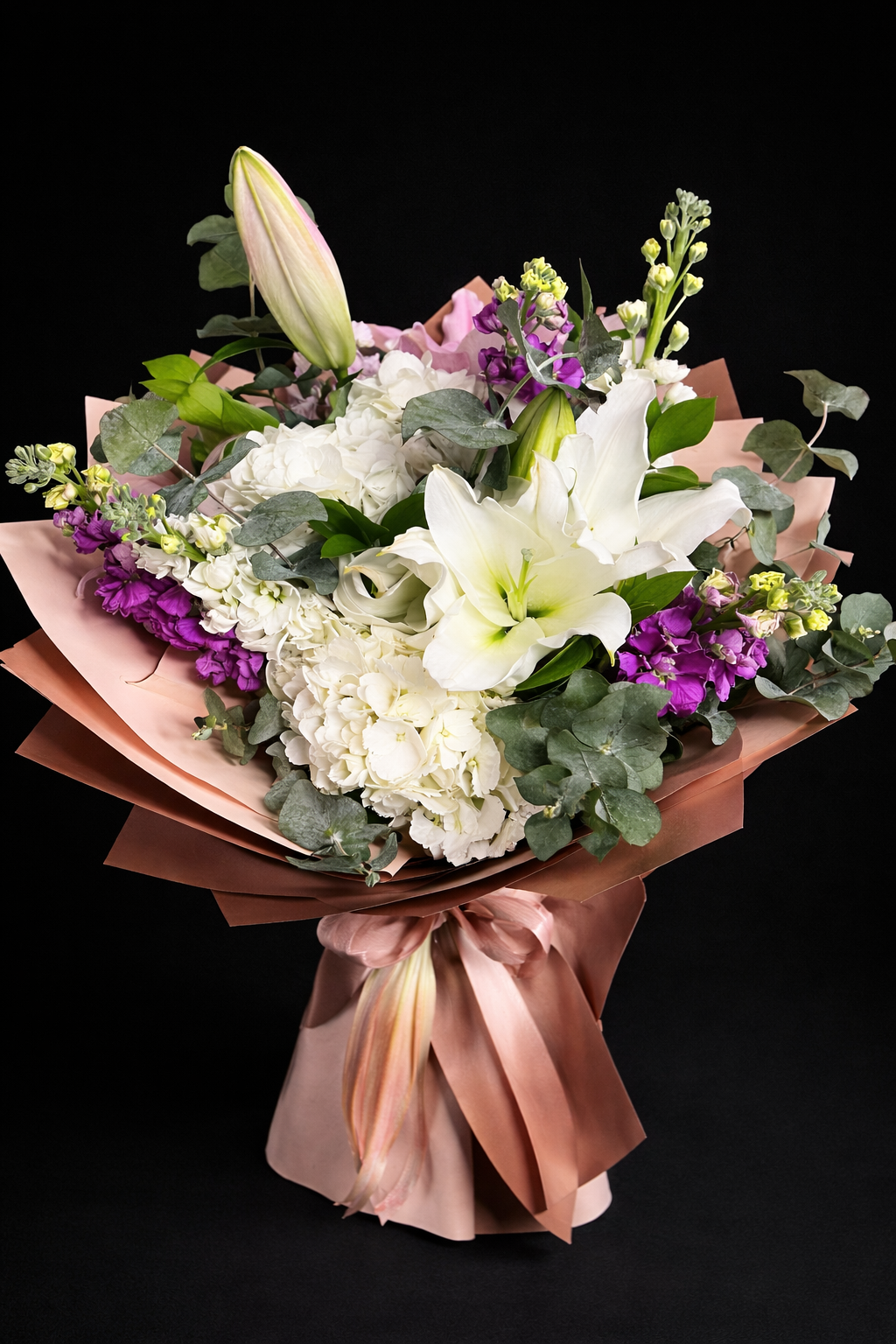 Ürünümüz de pembe ve beyaz lilyum 1 er adet toplamda 2 adet , beyaz ortanca 1 adet , 6 adet şebboy , okaliptüs bulunmaktadır.