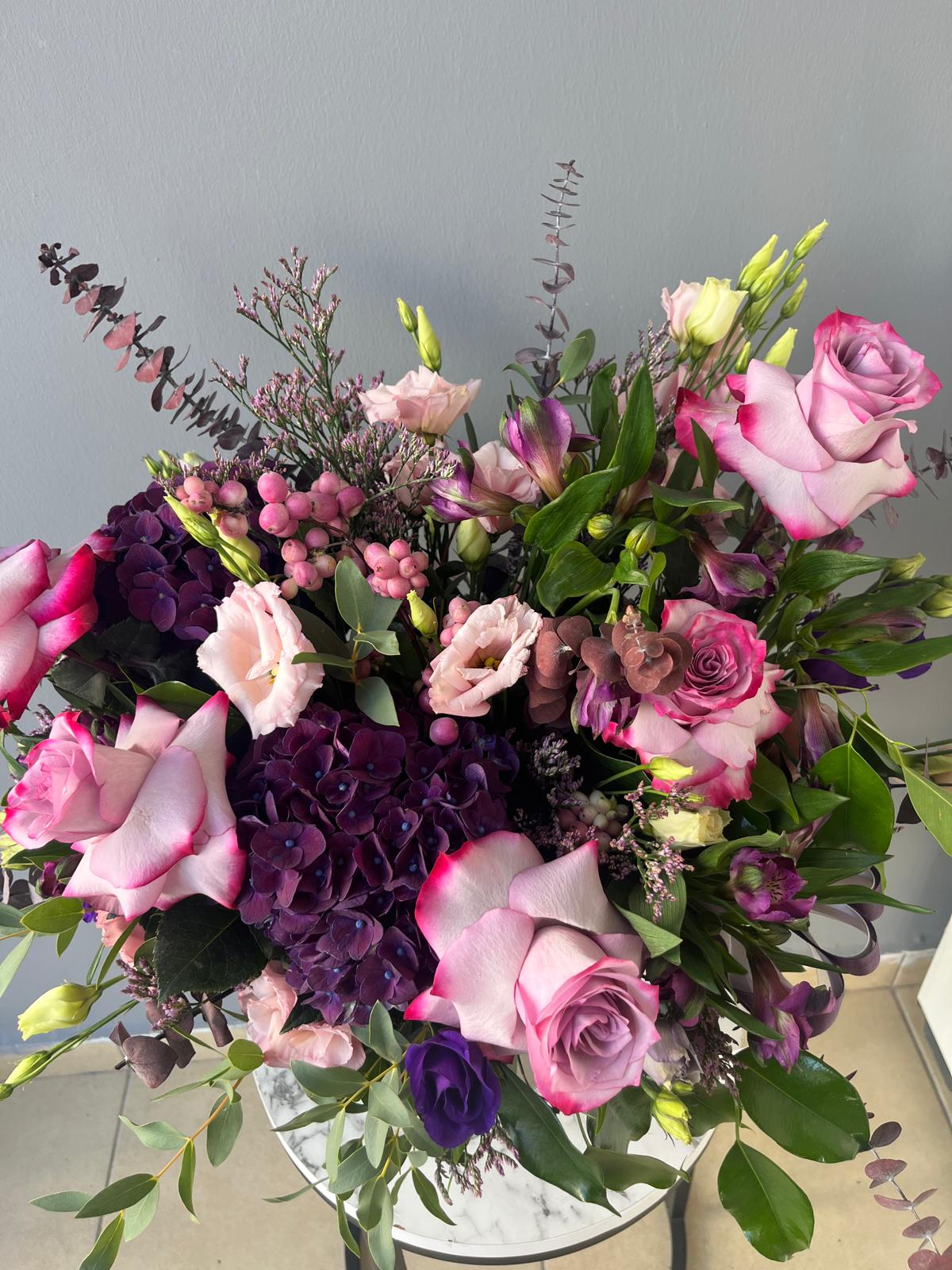 Lila ekvator gülleri ve ortancalı doğum günü aranjmanı