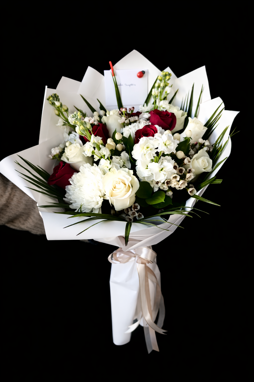 Ürünümüz de ithal 5 adet kırmızı ekvator gülü, 7 adet beyaz ekvator gülü,5 adet şebboy ,3 adet Anastasia,cipso , okaliptüs ve Fenix bulunmaktadır.