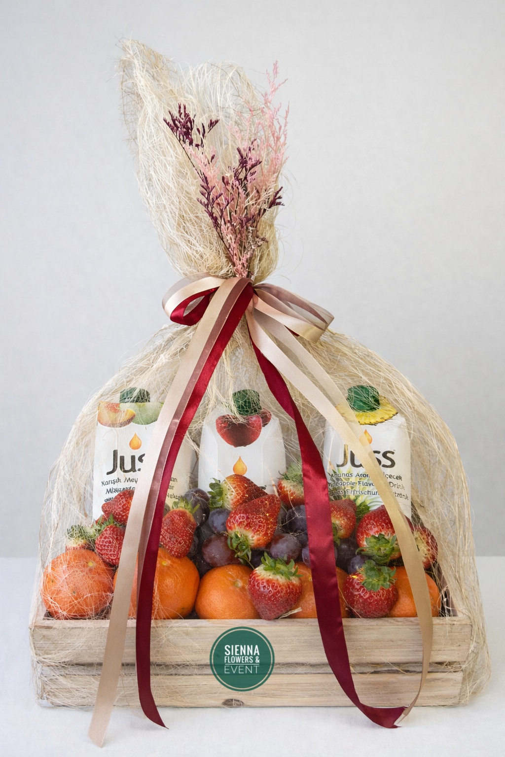 Ürünümüzde kutuda büyük boy aranjman ve ahşap kutuda meyve ve meyve suyu birlikte sunulmaktadır.Gorseldeki gibi birebir aynı olucak şekilde tasarlanmıştır.