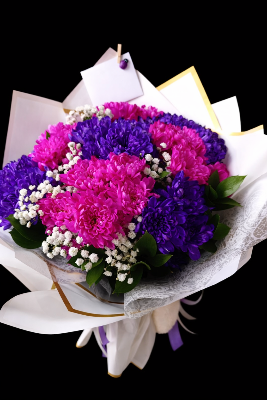 Ürünümüzde mor ve fuşya krizantem toplam 11 dal olup ayrıca 1 adet orta boy kalp balon ve büyük boy ayıcık bulunmaktadır.